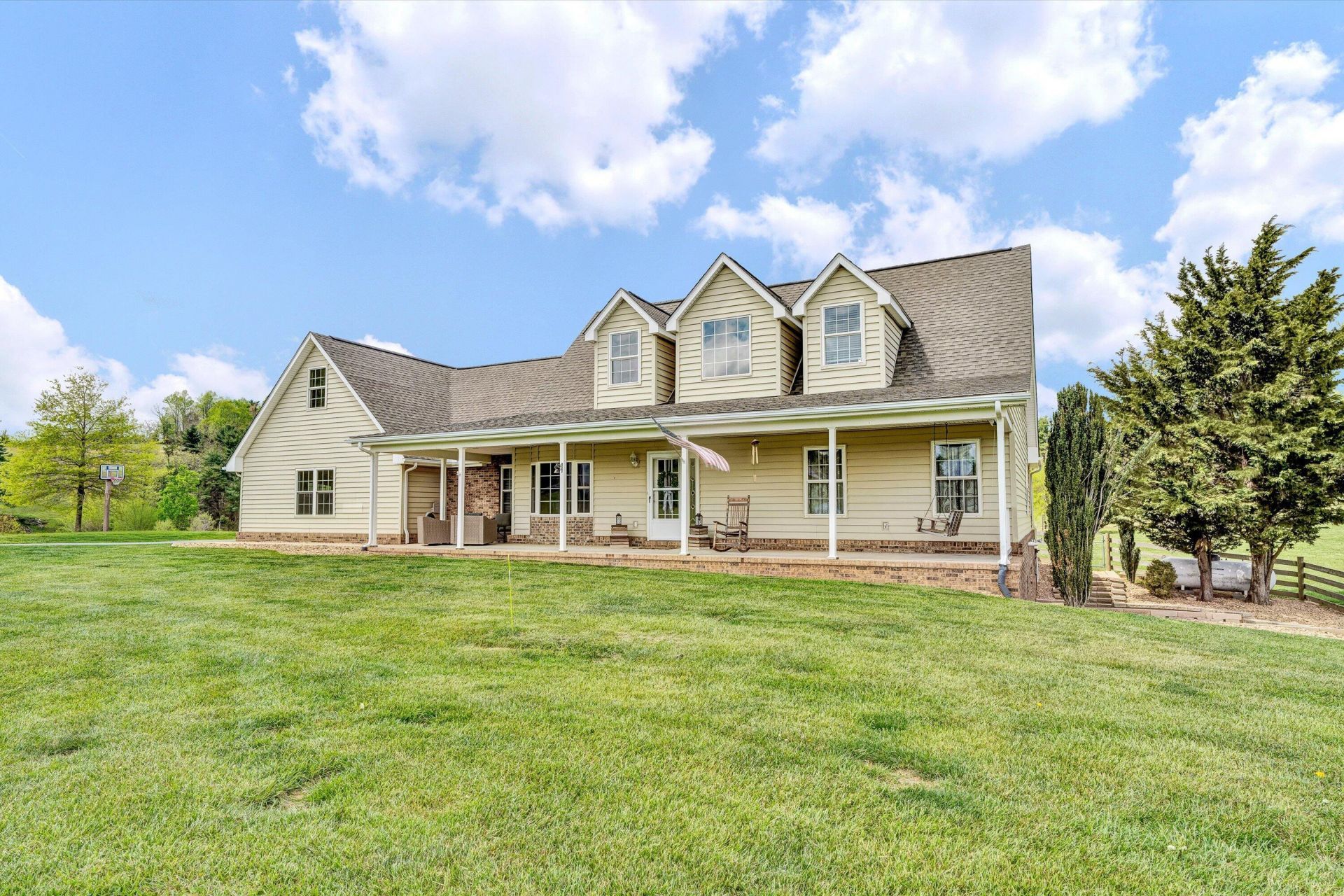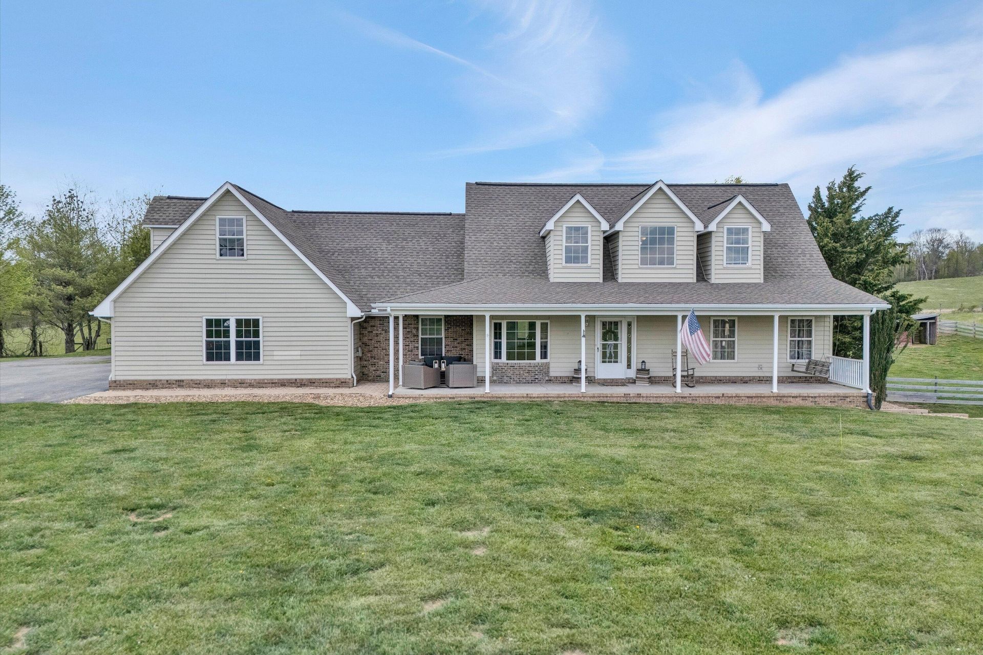 Refined country living in the heart of Floyd County. Set on 4.4 picturesque acres with sweeping mountain views, this Cape Cod offers privacy, tranquility, and exceptional curb appeal. Ideal for a mini farm, the property features fencing, barns, two pasture areas, and a storage shed.Inside, vaulted ceilings and abundant natural light create an airy, elegant feel. The main level includes two bedrooms, while the upper level offers two additional bedrooms plus a versatile loft. The finished basement provides a spacious rec or fitness room.Enjoy peaceful mornings on the covered front porch overlooking rolling countryside. A rare opportunity to own a serene, well-appointed retreat in one of Floyd County's most scenic settings.